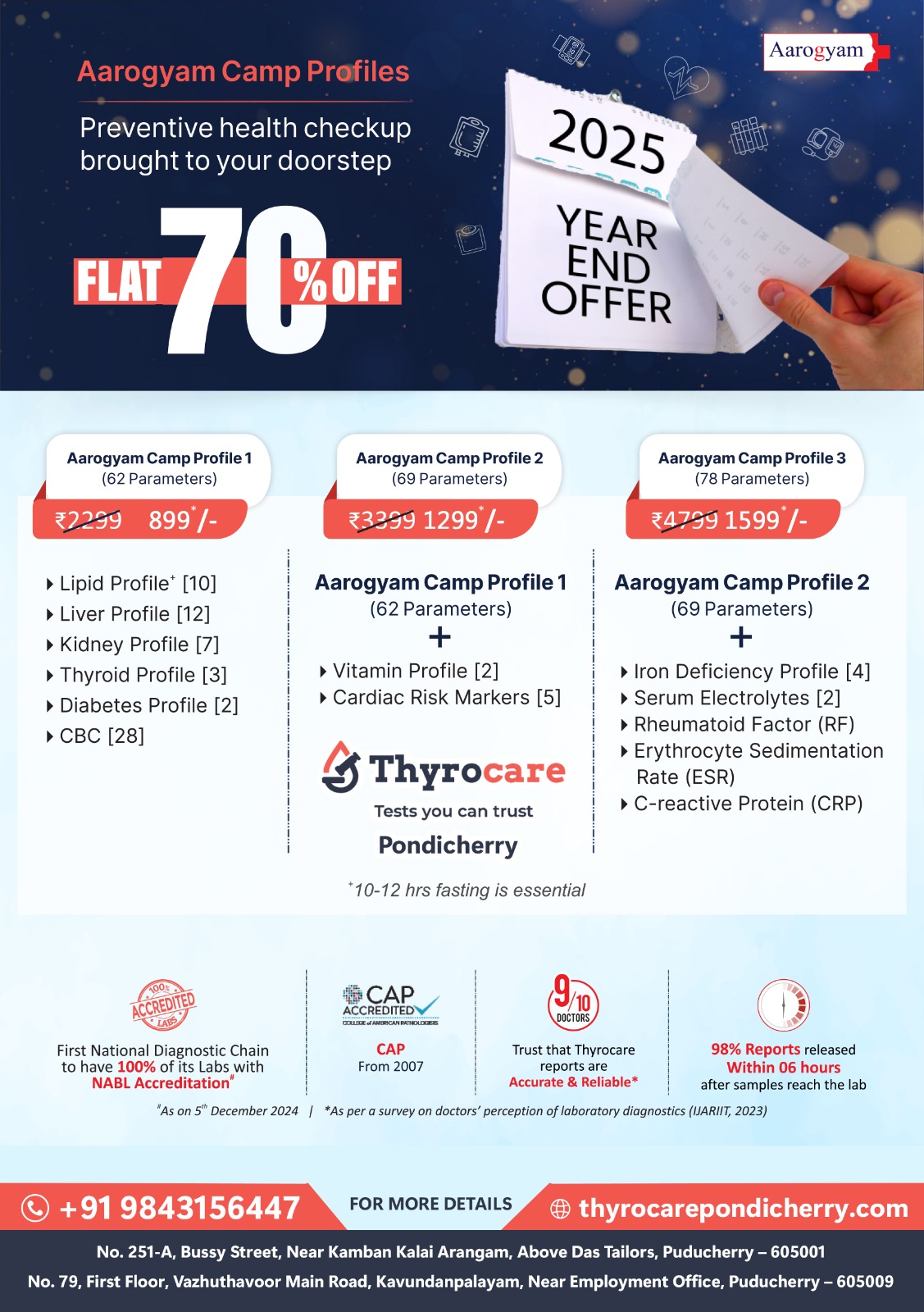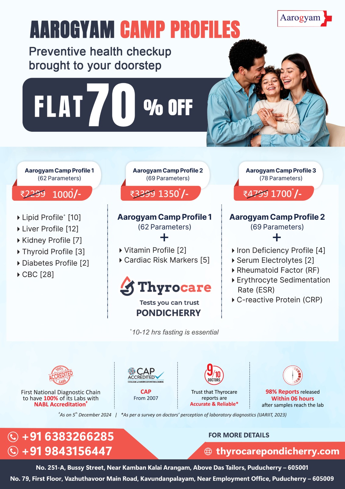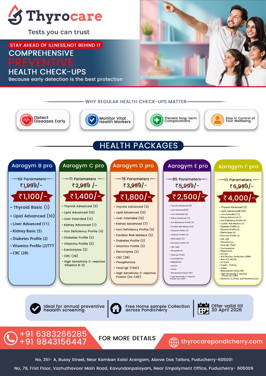 Welcome to Thyrocare Pondicherry – your trusted partner for affordable and accurate health checkups. We offer home sample collection for a wide range of lab tests, including full body checkups and thyroid tests, ensuring maximum comfort and convenience. Powered by India’s leading automated laboratory network, we deliver quick, reliable results across Puducherry.