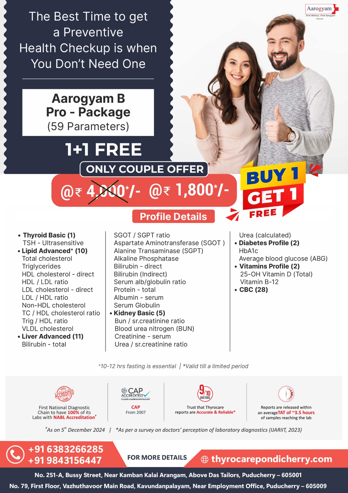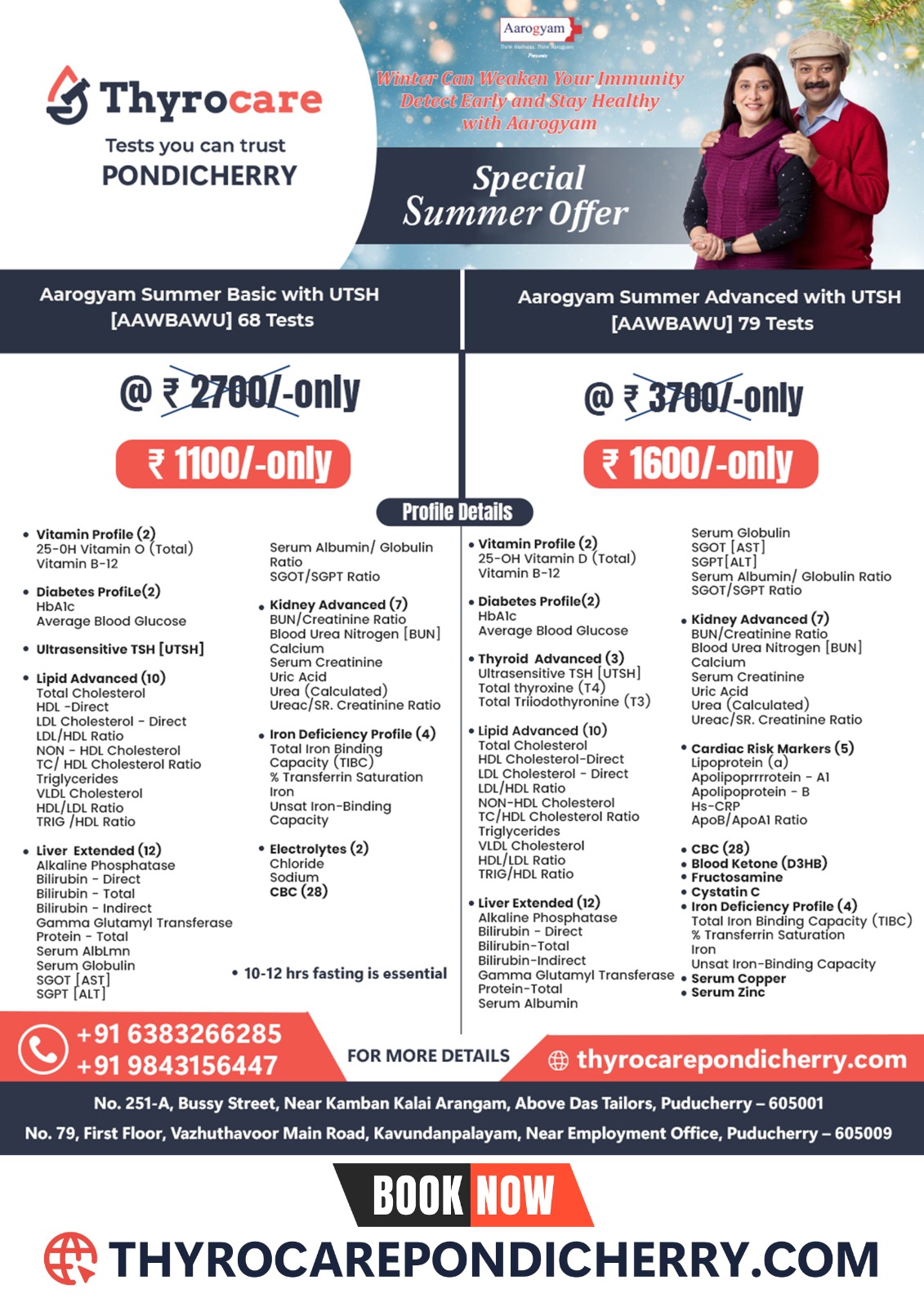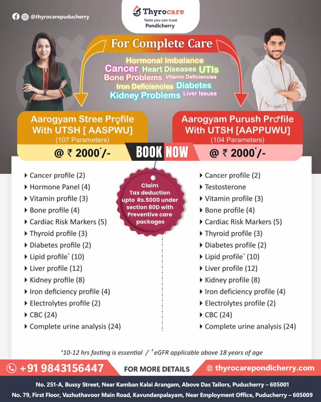 Welcome to Thyrocare Pondicherry – your trusted partner for affordable and accurate health checkups. We offer home sample collection for a wide range of lab tests, including full body checkups and thyroid tests, ensuring maximum comfort and convenience. Powered by India’s leading automated laboratory network, we deliver quick, reliable results across Puducherry.